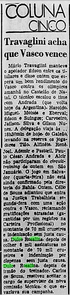 Dulce Rosalina, depois de o irmão do treinador , Carlos de Souza, resolveu aceitar o cargo de Supervisor da nova Comissão Técnica, o que esvaziava sua campanha. 30 de Junho de 1972