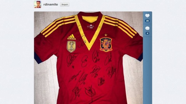 Pegar um autógrafo de um jogador da seleção da Espanha, a melhor do mundo na atualidade, não deve ser fácil. Imagine, então, de 13 craques da Fúria? A passagem dos espanhois por São Januário, em treinos realizados no local durante a Copa das Confederações, rendeu um belo presente ao atacante Rodrigo Dinamite, filho do presidente do Vasco, Roberto Dinamite. O jogador postou nesta segunda-feira no Instagram uma foto da camisa vermelha com 13 assinaturas.
