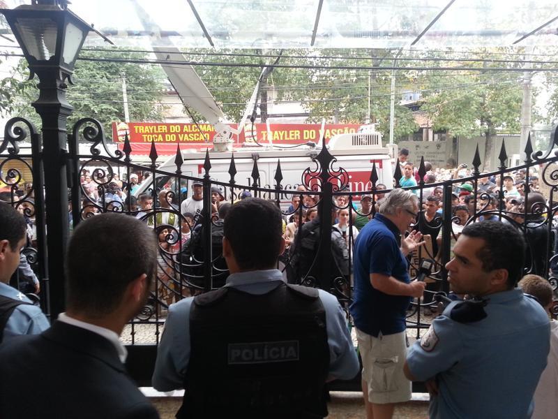 Seguranças da Seleção e alguns policiais chegam ao portão principal de São Januário para que se evite uma confusão.