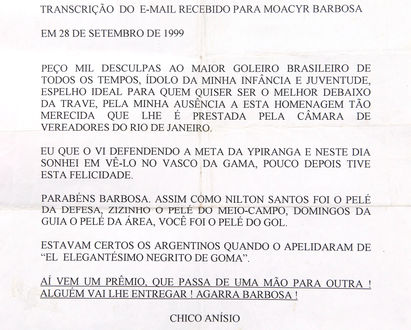 “Não acredito em coincidência. O Eurico estava reunindo os campeões do Sul-americano de 1948 e só foi saber que o Barbosa estava vivo porque viu uma reportagem com ele. Fomos para a festa e o jogo de homenagem e ele ficou muito feliz”, recordou, avisando que Barbosa não teve coragem de pedir ajuda ao clube que defendeu por amor.