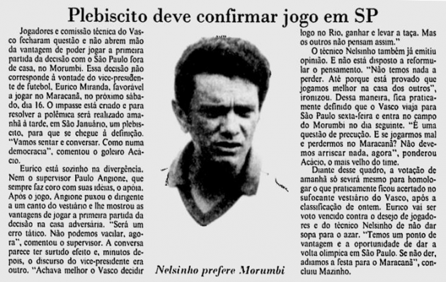 Os atletas, entretanto, junto com o treinador Nelsinho, ponderavam que as atuações daquela fortíssima equipe fora de casa, principalmente as últimas (o Vasco havia vencido Corínthians e Internacional nas rodadas finais da fase de classificação), davam força para um derradeiro triunfo em pleno Morumbi, que daria o título ao Vasco sem a necessidade de novo duelo.