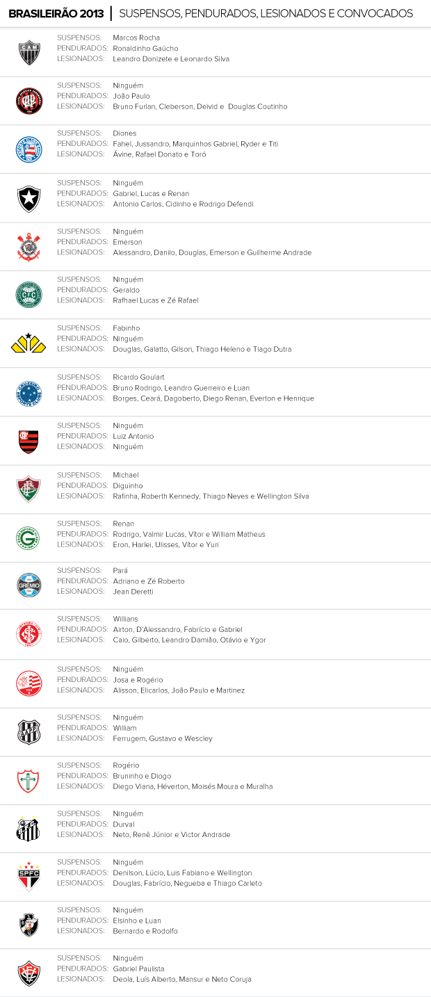 Confira abaixo a lista de todos os lesionados e suspensos da rodada#6: