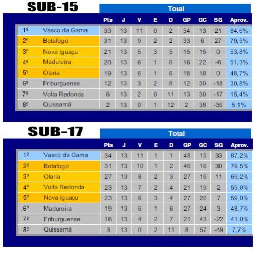 A rodada do último final de semana não modificou muita coisa na tabela de classificação dos Campeonatos Estaduais sub-15 e sub-17. O Vasco da Gama venceu suas partidas contra o Volta Redonda e se manteve na liderança do grupo A nas duas categorias. O Botafogo também fez sua parte e derrotou duas vezes o Friburguense, porém segue atrás o Gigante da Colina.