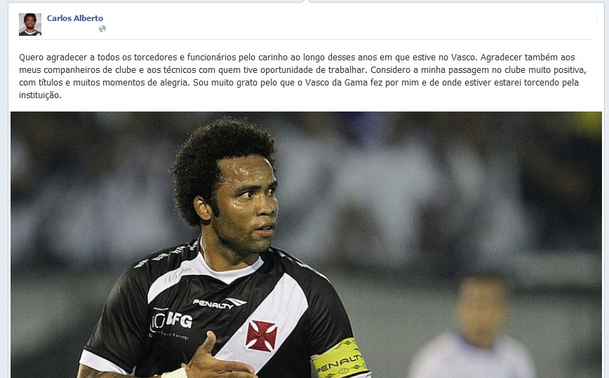 Quero agradecer a todos os torcedores e funcionários pelo carinho ao longo desses anos em que estive no Vasco. Agradecer também aos meus companheiros de clube e aos técnicos com quem tive oportunidade de trabalhar. Considero a minha passagem no clube muito positiva, com títulos e muitos momentos de alegria. Sou muito grato pelo que o Vasco da Gama fez por mim e de onde estiver estarei torcendo pela instituição.