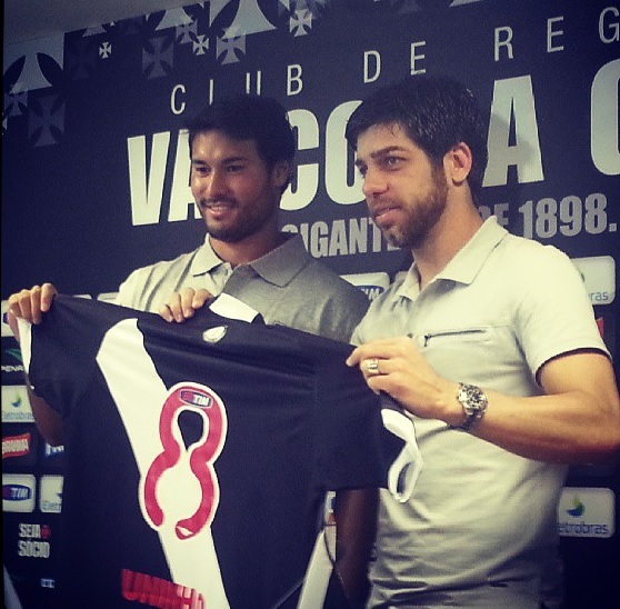 Pedro Ken cedeu sua camisa nº 8 para Juninho Pernambucano, que está sendo apresentado neste momento na sala de imprensa de São Januário em seu retorno ao Vasco da Gama.