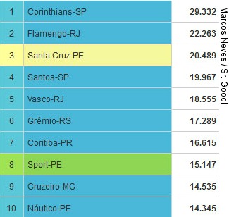 Na segunda colocação, o Flamengo apresenta média de 22.263 pagantes. O clube carioca turbinou sua média levando o duelo contra o Coritiba para o Mané Garrincha, em Brasília. Enquanto isso, o Santa Cruz, mesmo na Série C, ocupa o terceiro lugar com média de 21.014 pagantes.
