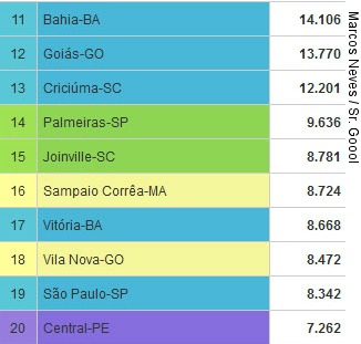 Os clubes em azul representam a Série A, enquanto a Série B está em verde. O amarelo traz os clubes da Série C e o roxo representa a última divisão nacional. No ranking de público do Sr. Goool, você - torcedor-internauta - pode comparar as médias de público das quatro divisões. Basta agrupar os campeonatos no link "ranking".