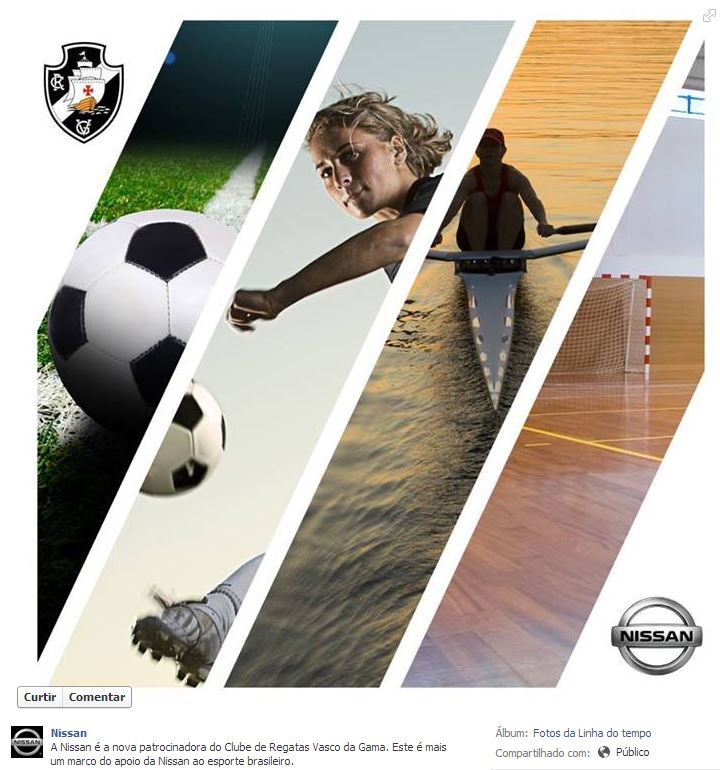 Através de seu perfil oficial no Facebook, a montadora japonesa Nissan, celebrou o acordo de patrocínio com o Vasco da Gama. O acordo tem validade de quatro anos. A logomarca da Nissan será colocada na parte superior das costas e nos shorts de todos os uniformes oficiais e secundários de jogo, treino e viagem, equipamentos de cada modalidade, bem como no site oficial, redes sociais e na sinalização das três sedes do clube. Confira a imagem: