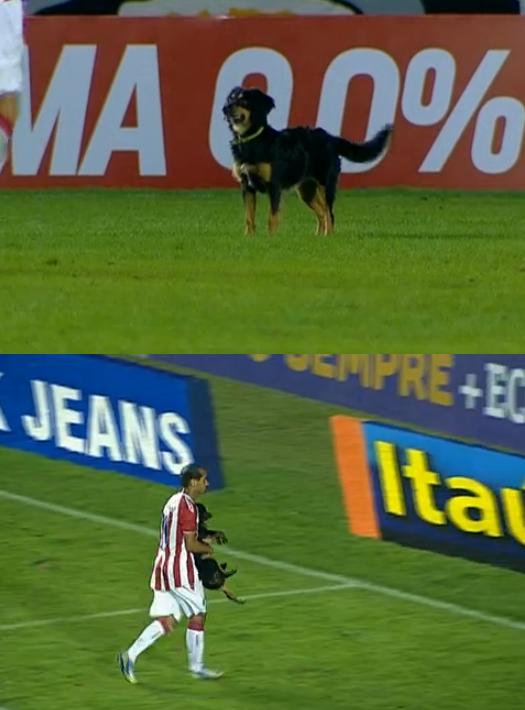 Um cachorro invadiu o gramado de São Januário durante o jogo Botafogo x Náutico, pelo Campeonato Brasileiro, na noite deste sábado (20/07). A invasão ocorreu aos 6 minutos do 2º tempo da partida, que acabou com a vitória alvinegra por 2 a 0. Dócil, o cão foi retirado de campo pelo ex-vascaíno Rodrigo Souto, hoje no Náutico.
