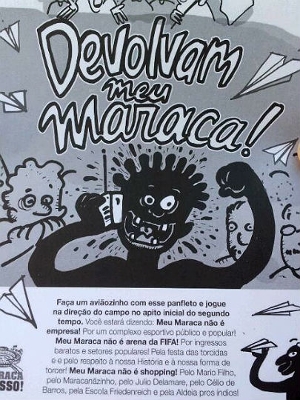 O texto escrito no panfleto continha frases como "devolvam meu Maraca", "meu Maraca não é shopping", "meu Maraca não é arena da Fifa" e "meu Maraca não é empresa".