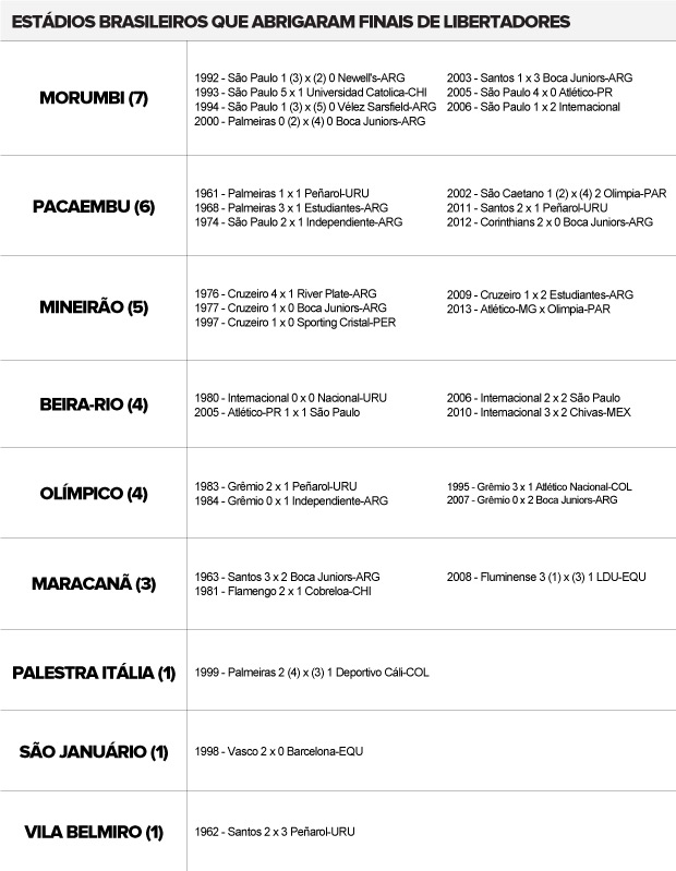 Veja a lista de finais da Libertadores realizadas no Brasil: