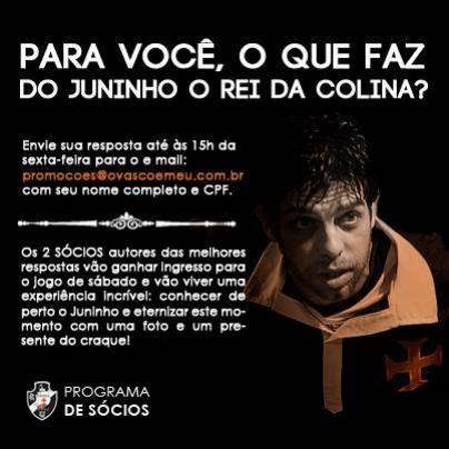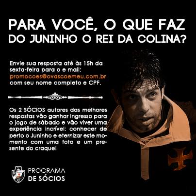 Além de ganhar ingresso para o jogo do próximo sábado (27/7), em São Januário, contra o Criciúma, dois sócios do clube terão a rara oportunidade de conhecer o ídolo Juninho. Para participar da promoção, basta fazer parte do Programa de Sócios do Vasco e enviar e-mail para promocoes@ovascoemeu.com.br, até as 15h da próxima sexta-feira (26/7), informando o número do CPF e a resposta para seguinte pergunta: "para você, o que faz do Juninho o Rei da Colina?" Os autores das duas melhores respostas serão os ganhadores do concurso cultural.