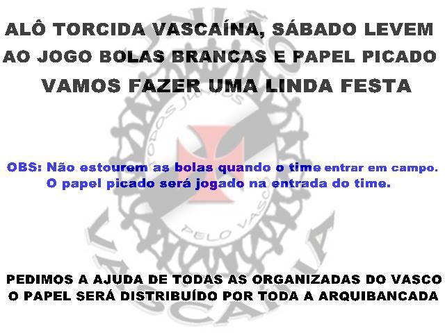 Gostaríamos de salientar da importância do comparecimento de todos os nossos associados, devidamente uniformizados, visto que, teremos várias novidades, e temos a obrigação de impulsionar o Vasco da Gama, rumo a mais uma vitória e a conquista dos 3 pontos, pois temos total ciência da importância de mais uma vitória para dar sequência esta fase boa.