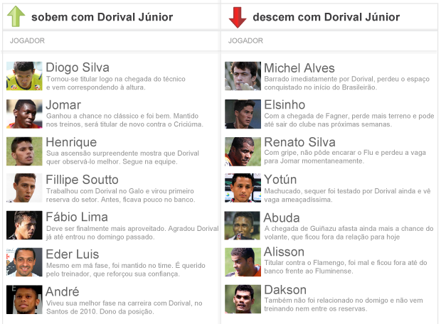 Fica mesmo clara a característica de Dorival de pinçar opções da base, repetindo 2009, quando revelou Allan e Philippe Coutinho e deu moral a novatos como Ramon, Souza e Pimpão. De lado em São Januário desde janeiro, Jomar entrou na fogueira no domingo, causou a expulsão de Fred, foi seguro e vai deixar Renato Silva no banco no duelo frente ao Tigre. O meia Fábio Lima é outro que saltou na frente e participou do clássico no Maracanã.