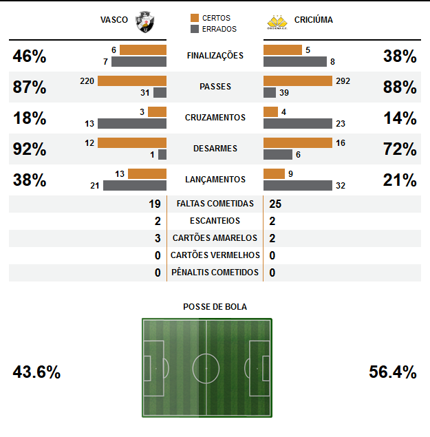 Por outro lado, o Vasco mostrou efetividade nas finalizações. Em 13 conclusões a gol, os comandados de Dorival Júnior acertaram a meta de Bruno em seis oportunidades enquanto o Criciúma deu trabalho para Diogo Silva em apenas cinco chutes.