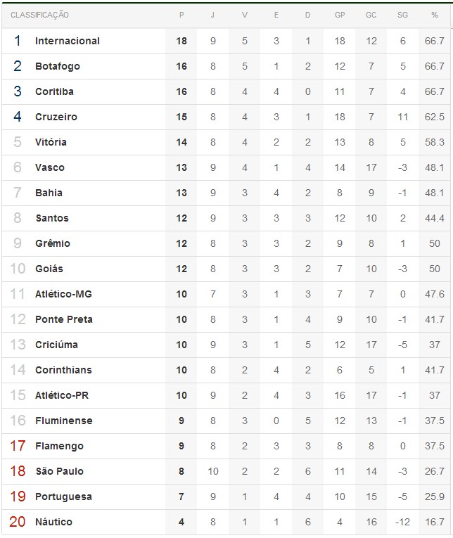 Com a vitória sobre o Criciúma neste sábado, o Vasco vai "dormir" na 6ª colocação na tabela. A zona de classificação para a Libertadores é composta por Internacional, Botafogo, Coritiba e Cruzeiro. Na zona de rebaixamento estão Flamengo, São Paulo, Portuguesa e Náutico.