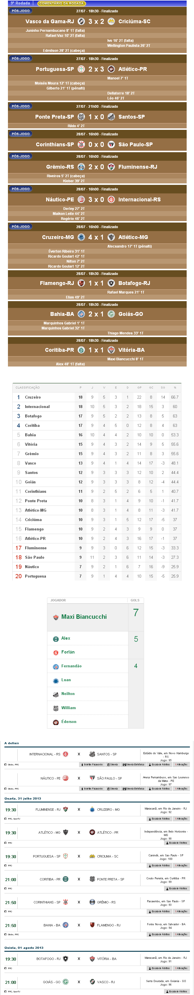 Terminada a 9ª rodada do Campeonato Brasileiro, o Vasco, que derrotou o Criciúma por 3 a 2, subiu do 11º para o 8º lugar na tabela. O Gigante da Colina está 4 pontos abaixo da zona de classificação à Libertadores da América.
