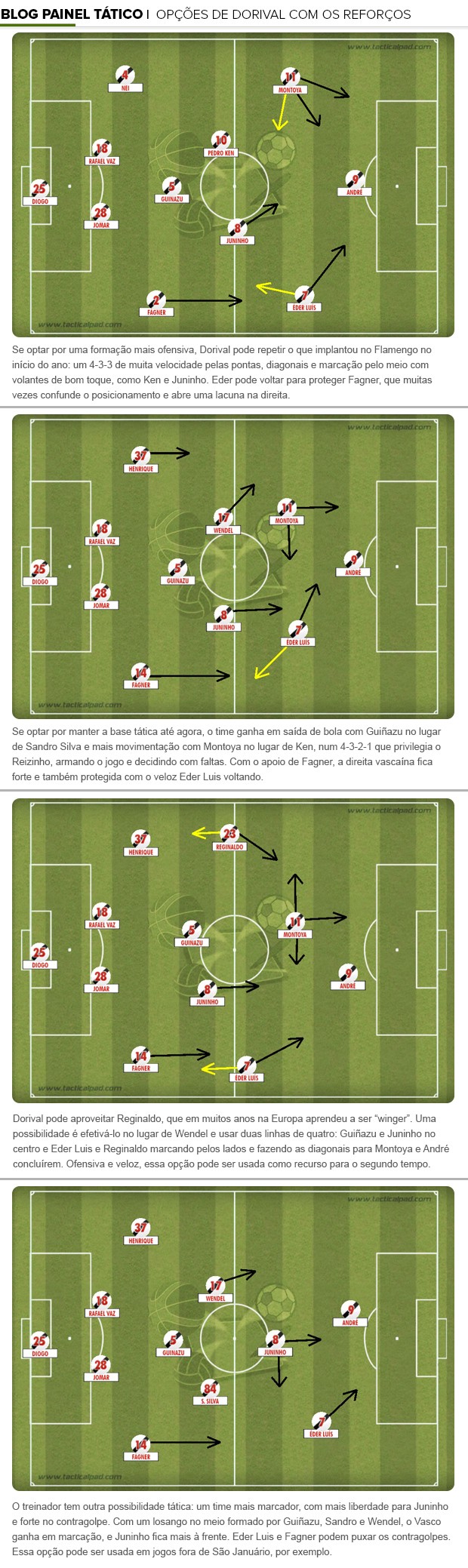 - Na ocasião, Dorival manteve o 4-2-3-1 usado por Autuori, com algumas mudanças: Eder Luis na ponta e Pedro Ken oficialmente como meia. Pouco treinada, a formação não deu encaixe, e o Vasco pouco concluiu a gol. Nos dias seguintes e com as contratações, ele resgatou um sistema conhecido: o 4-3-1-2, o losango usado durante todo o ano de 2009, na Série B. Sem a bola, o time adotou postura agressiva na marcação da saída de jogo adversária, como na grande vitória sobre o Fluminense - explicou.