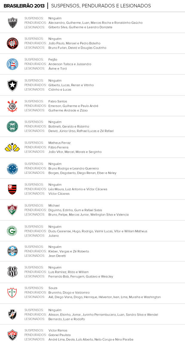 O cartoleiro também deve ficar atento aos desfalques de Atlético-MG, Coritiba e Vitória. No Galo, Gilberto Silva com uma entorse no joelho direito não enfrenta o Atlético-PR, no Independência. Já o Coxa encara a Ponte Preta sem Deivid , Júnior Urso, Rafhael Lucas e Zé Rafael, todos por motivo de lesão. Enquanto o time baiano não terá seis jogadores. Dentre eles, o zagueiro Victor Ramos , que cumprirá suspensão pelo acúmulo de amarelos, e o recém-contratado André Lima com uma lesão no joelho esquerdo.