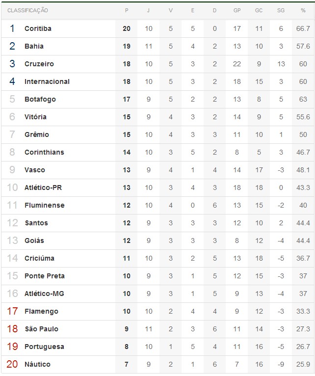 O Vasco só joga nesta quinta-feira, contra o Goiás. Com os resultados dos jogos desta quarta-feira, o Gigante da Colina caiu do 8º para o 9º lugar na classificação do Brasileiro. A zona de classificação para a Libertadores é composta por Coritiba, Bahia, Cruzeiro e Internacional. Na zona de rebaixamento estão Flamengo, São Paulo, Portuguesa e Náutico.