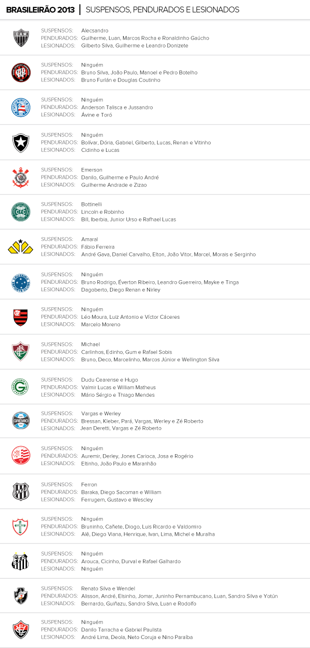 Confira abaixo a lista completa com os lesionados e suspensos da rodada#12: