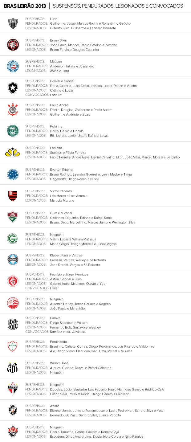 Confira abaixo a lista completa com os lesionados e suspensos da rodada#13: