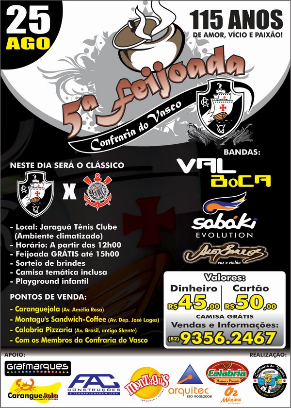 A Confraria do Vasco está organizando a 5ª Feijoada em comemoração ao 115º aniversário do Club de Regatas Vasco da Gama em Maceió, Alagoas.