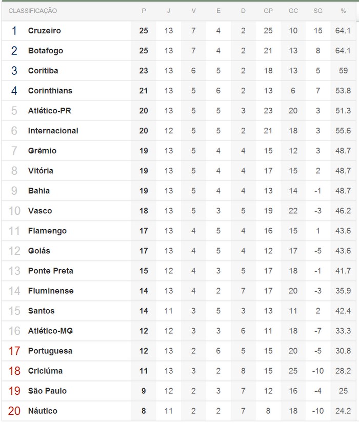Terminada a 13ª rodada do Campeonato Brasileiro, o Vasco, que venceu o Coritiba por 1 a 0, se manteve no 10º lugar na tabela. O Gigante da Colina está 3 pontos abaixo da zona de classificação à Libertadores da América e 6 pontos acima da zona do rebaixamento.