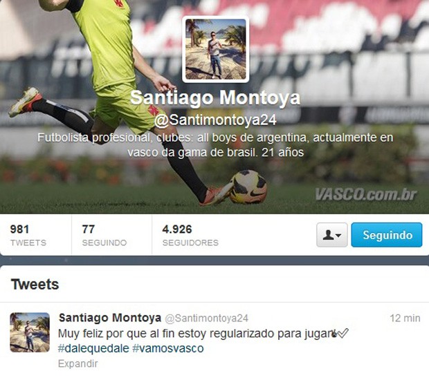 Regularizado nesta segunda-feira e consequentemente livre para enfrentar o Santos, na quarta-feira, na Vila Belmiro, o meia-atacante Santiago Montoya externou sua satisfação via Twitter, lançando mão de expressão muito utilizada em estádios sul-americanos: