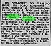 Hoje durante as representações da revista de J. Maia será homenageado o Clube de Regatas Vasco da Gama desfilando no palco, comandados pelo Chefe da Torcida Organizada, João de Lucca, todos os cracks do Campeão de 1945.