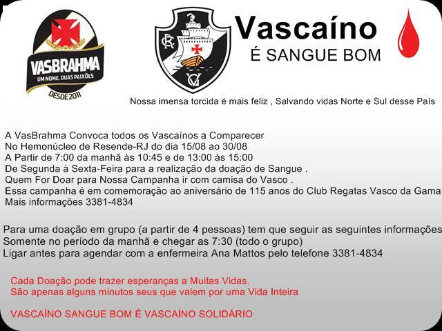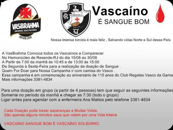 VasBrahma convoca vascaínos para campanha de doação de sangue a partir desta 5ª-feira em Resende