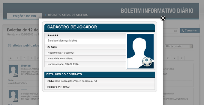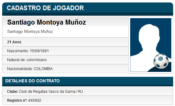 A nacionalidade do meia Santiago Montoya foi corrigida no Boletim Informativo Diário (BID) da CBF. Quando Montoya teve seu nome registrado, ele aparecia como brasileiro. No entanto, já é possível ver que o jogador já consta como colombiano no sistema.