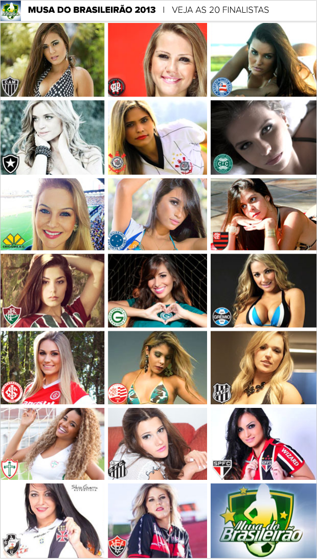 A espera acabou. Após mais de uma semana de votação, as 20 finalistas do concurso Musa do Brasileirão 2013 foram escolhidas. As candidatas a ocupar o posto que foi de Martina Spier, torcedora do Grêmio, no ano passado são: Isabella Oliveira (Atlético-MG), Fernanda Carolina (Atlético-PR), Carol Muniz (Bahia), Monaliza Quintes (Botafogo), Luana Ferreira (Corinthians), Bárbara Ludwig (Coritiba), Nani Gazinski (Criciúma), Josi Neves (Cruzeiro), Larissa Pacífico (Flamengo), Bruna Barreto (Fluminense), Hélika Rios (Goiás), Michele Recktenwald (Grêmio), Andressa Andreis (Internacional), Claris Massena (Náutico), Priscila Possato (Ponte Preta), Verônica Bolani (Portuguesa), Cynthia Macchia (Santos), Cris Andrade (São Paulo), Débora Araújo (Vasco) e Hellen Cristyan (Vitória).