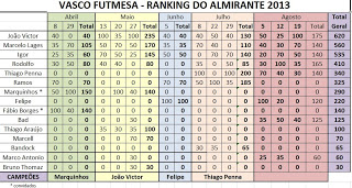 Dando continuidade a disputa do Ranking do Almirante 2013, foi realizada na noite de ontem (19/08) mais um torneio válido pelo mês de Agosto. Após tríplice empate na pontuação, João Victor ficou com o simbólico título da noite no critério saldo de gols, seguindo também na liderança do Ranking Anual.