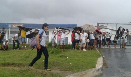 Nem mesmo a chuva forte no local do jogo afastou os torcedores, que usam as bandeiras para se proteger da água. A maior parte dos cerca de 50 torcedores presentes é de vascaínos, ansiosos para ver o time do coração jogando em Manaus.