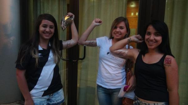 Três vascaínas deram uma grande demonstração de amor ao ídolo Juninho Pernambucano na manhã da última sexta-feira (24/08). Thauny Gomes (20 anos), sua irmã Rayssa Gomes (18 anos) e a amiga Kerolainy Andrade (19), deixaram de ir trabalhar para fazer uma tatuagem em homenagem ao meia. Escondidas dos pais, as três torcedoras tatuaram a assinatura de Juninho no braço e após o treino do Vasco, no clube Cota Mil, as fãs exibiram a tatuagem ao craque que não acreditou no que viu.