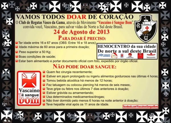 Neste sábado (24), os Vascaínos estarão salvando vidas de Norte a Sul deste Brasil: "VAMOS TODOS DOAR DE CORAÇÃO" - No HEMORIO ou em qualquer HEMOCENTRO do Brasil.