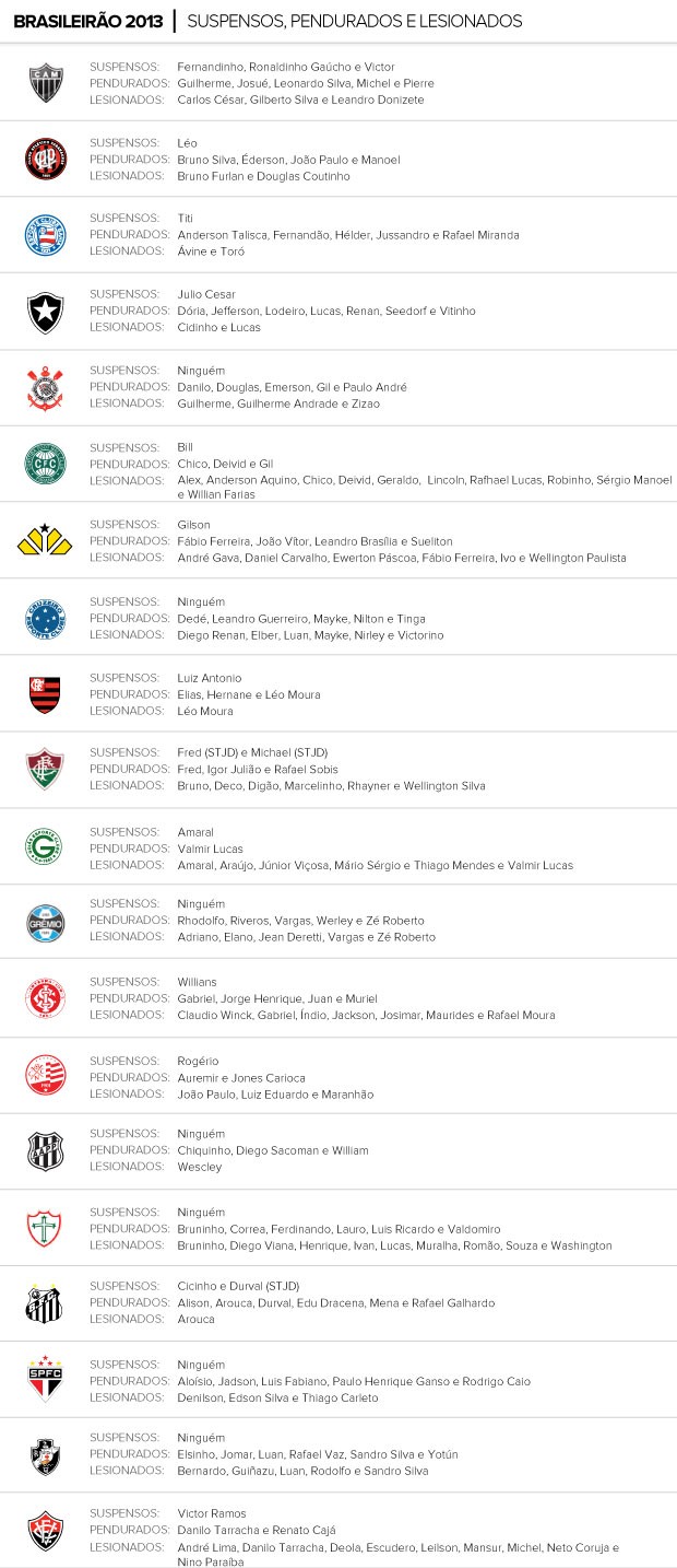 Confira abaixo a lista completa com os lesionados e suspensos da rodada#16: