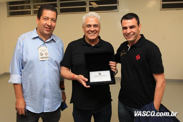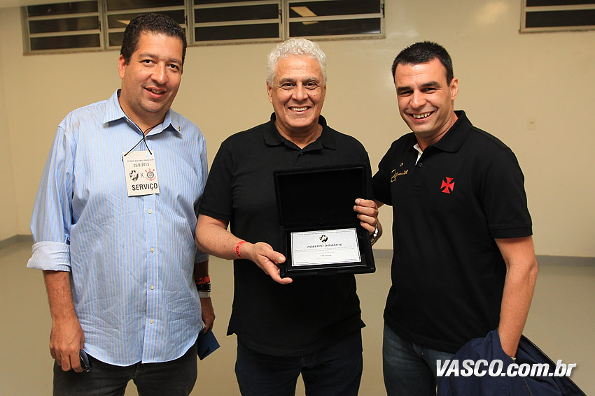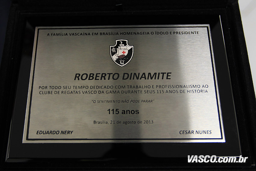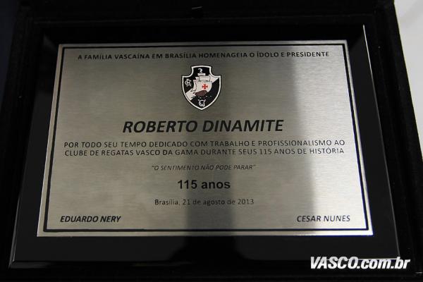 Neste domingo (25), antes da partida contra o Corinthians, o presidente Roberto Dinamite recebeu uma homenagem pelos 115 anos do Cruzmaltino. Eduardo Nery, diretor de Relações Institucionais do Vasco, e Cesar Nunes, sócio e amigo do presidente, entregaram uma placa parabenizando o mandatário e ídolo vascaíno por todo o tempo e trabalho dedicado ao Clube.