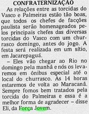 As relações entre as Torcidas do Vasco e Palmeiras estão tão boas, que todos os Chefes de facções Paulista serão homenageados pelos principais Chefes das diversas Torcidas do Vasco com um churrasco domingo, antes do jogo.