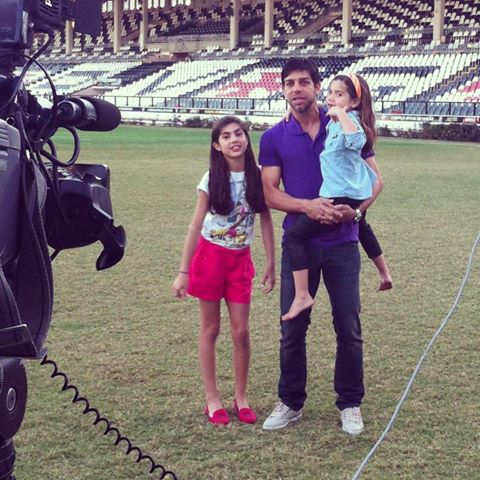 Juninho gravando chamada para o Criança Esperança com as filhas em São Januário.
