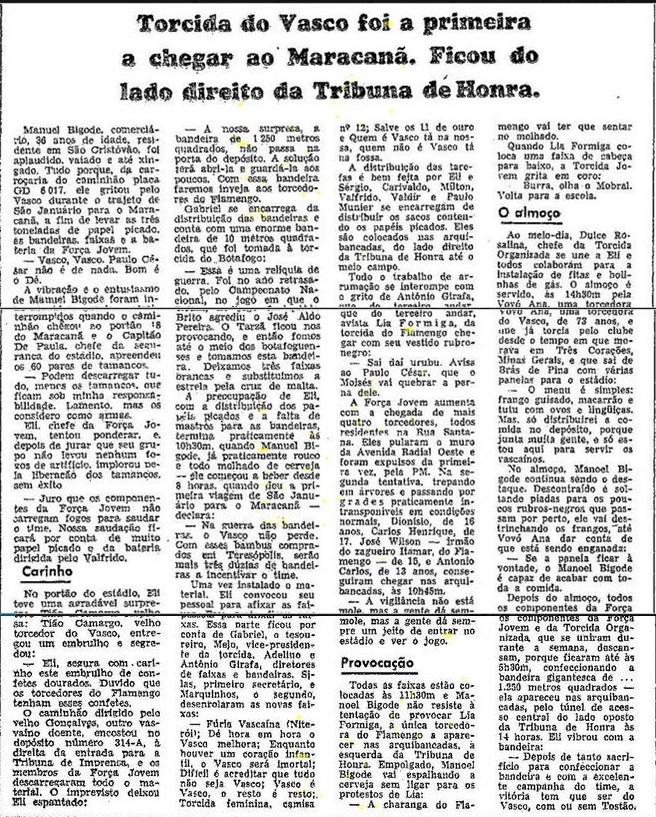Manoel Bigode, comerciário, 36 anos de idade, residente em São Cristóvão foi aplaudido, vaiado e até xingado. Tudo porque da carroceria do caminhão placa GD 6017, ele gritou pelo Vasco durante o trajeto de São Januário para o Maracanã, a fim de levar as 3 toneladas de papel picado, as bandeiras, faixas e a bateria da Força Jovem.