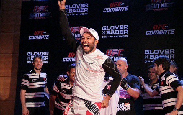 Fechado para o público e aberto apenas para a imprensa, o treino do "UFC Fight Night no Combate: Glover x Bader", em Belo Horizonte, recebeu a visita ilustre do elenco do Vasco, que no domingo foi derrotado pelo Cruzeiro no Mineirão e está hospedado no mesmo hotel dos lutadores. A atividade foi realizada no próprio hotel nesta segunda-feira e teve seis atletas se apresentando: Glover Teixeira, Ryan Bader, Ronaldo Jacaré, Yushin Okami, Rafael Sapo e Lucas Mineiro. Mas quem roubou a cena foi o lateral-direito Nei, da equipe cruz-maltina. Fã de MMA e praticante de muay thai e jiu-jítsu, ele foi presenteado pelo Ultimate com um par de luvas oficiais, deu entrevista para o site da organização e até foi quedado por Glover após uma encarada de brincadeira.