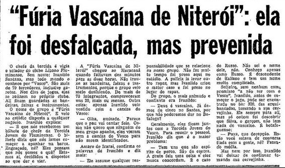 A Fúria Vascaína de Niterói, chegou ao Maracanã quando faltavam dez minutos para as duas horas. Não trouxe as bandeiras, faixas e instrumentos, porque o grupo veio meio desfalcado. De mais de 70 integrantes, compareceram uns 20, mais ou menos. Outra coisa: apenas Ivanildo veio vestido com a camisa do Vasco.