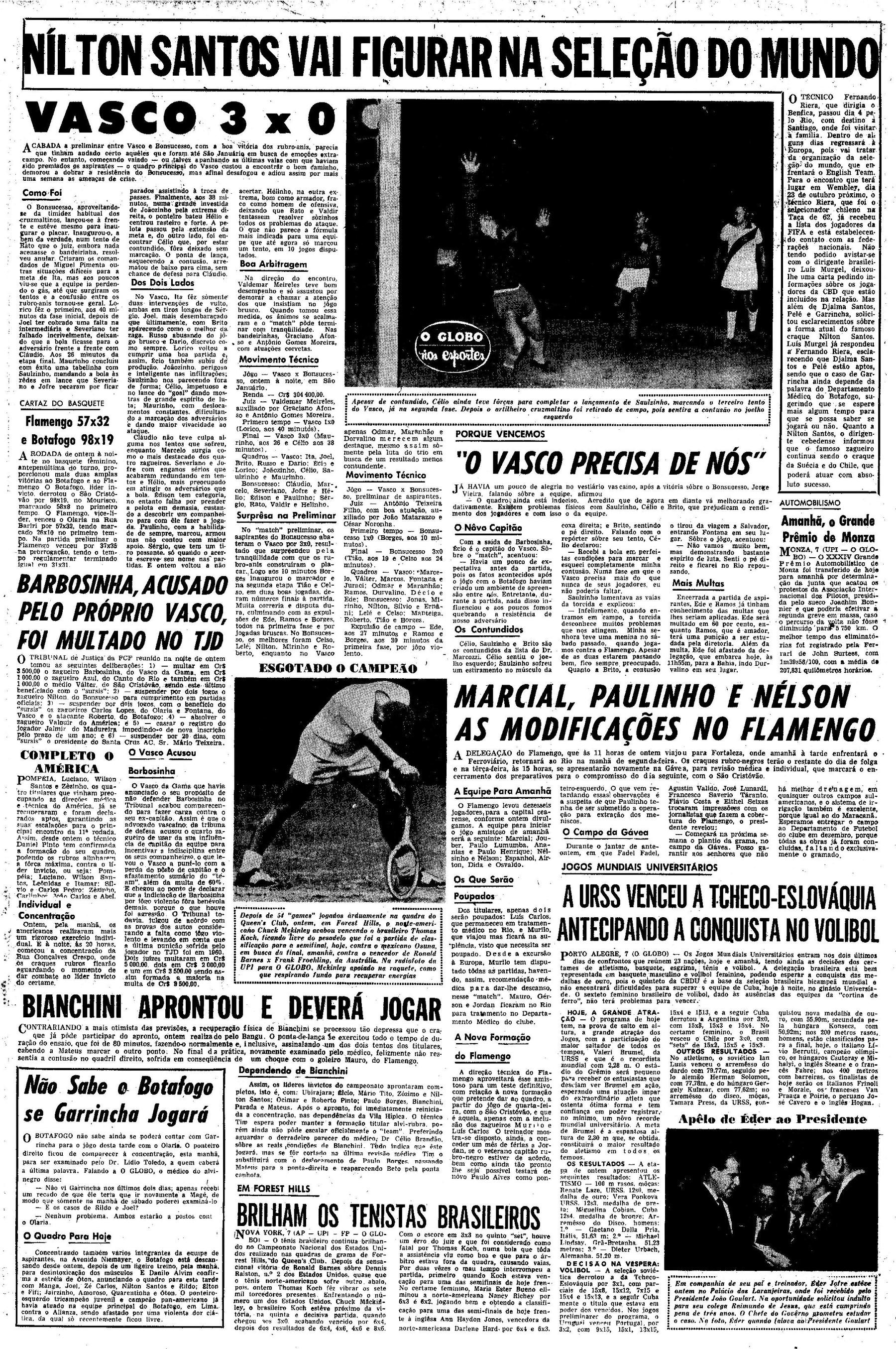 O Vasco, que havia anunciado o seu propósito de não defender Barbosinha no TJD, acabou comparecendo para fazer carga contra o seu jogador. Assim é que o advogado vascaíno da tribuna de defesa acusou o quarto zagueiro de usar sua influência de capitão da equipe para incentivar a indisciplina entre os seus compenheiros, o que levou o Vasco a puní-lo com a perda do pôsto de capitão e o afastamento sumário do team, além da multa de 60%. E chegou ao ponto de declarar que a indicação de Barbosinha por fôgo violento fôra benévola demais porque o que houve foi agressão. No fim, O o tribunal multou Barbosinha em Cr$ 3.500,00.