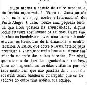 Muito bacana a atitude de Dulce Rosalina e da Torcida Organizada do Vasco no sábado, na hora do jogo contra o Internacional de Porto Alegre.