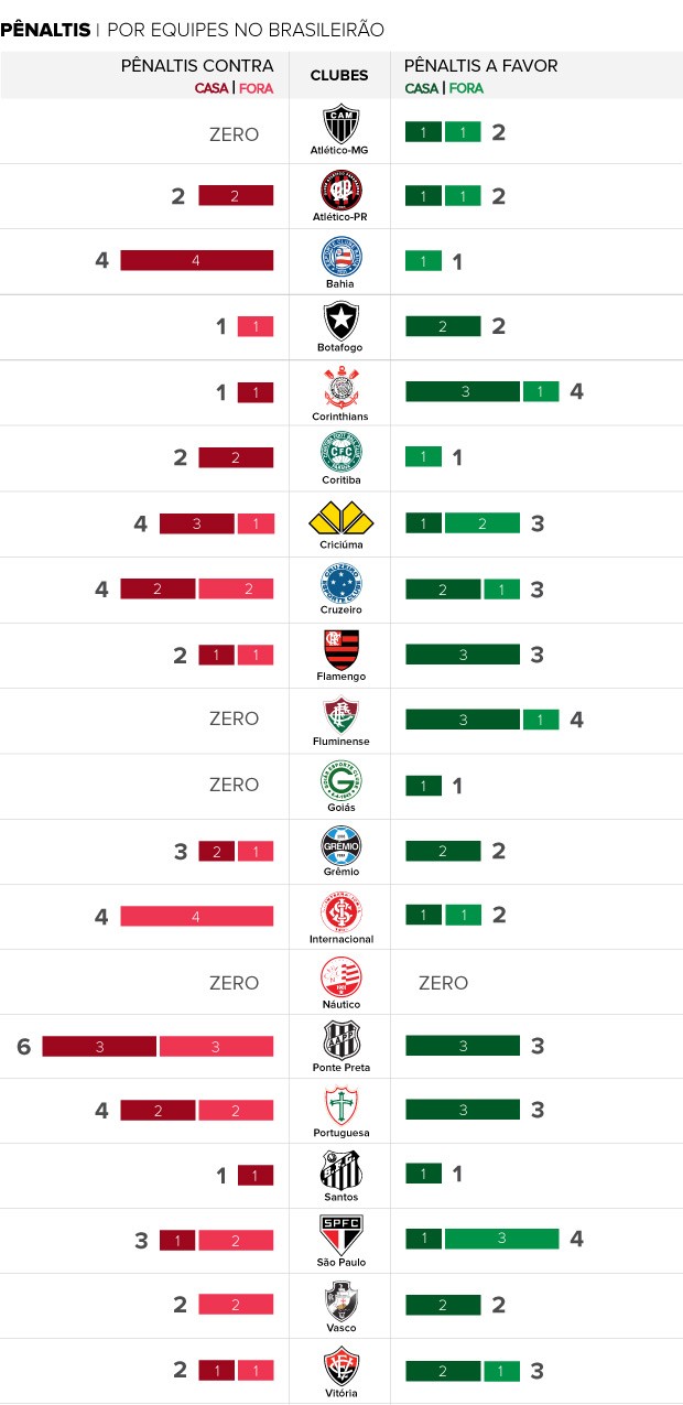 Confira os pênaltis sofridos e cometidos por equipe até a 19ª rodada: