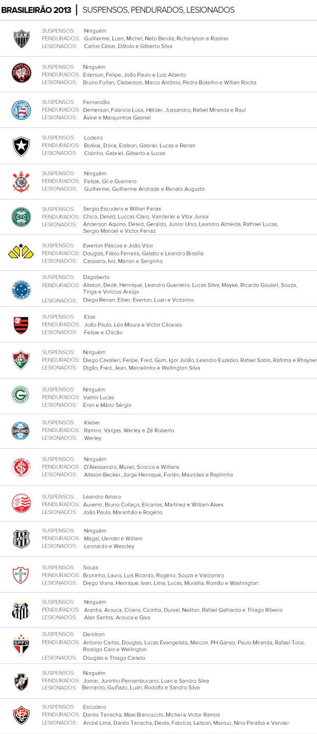 O calendário de 2013 do Brasileirão está ainda mais complicado para os clubes, devido ao alongamento da Copa do Brasil, excursões para a Europa, como a do São Paulo, e os já habituais jogos de quarta e domingo. Isso tudo demanda elenco e excelente preparo físico, mas nem sempre é possível evitar lesões, um dos motivos dos tantos desfalques dos clubes. Há também suspensões por cartão e impostas pelo STJD. Para a 21ª rodada, o panorama não é diferente. Fica difícil até avaliar quem são os maiores prejudicados por ausências. Mas o GLOBOESPORTE.COM traz a lista de quem ficará fora na rodada de fim de semana, até para ajudar os internautas a não marcar bobeira na hora de escalar o Cartola.