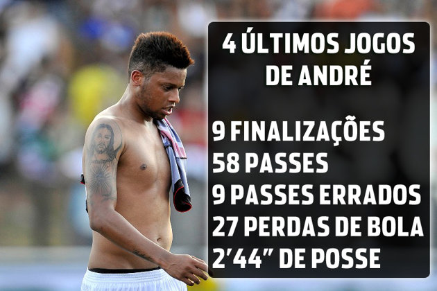 Além dos chutes para fora, as atuações de André têm marcado pela apatia e falta de participação nas jogadas de ataque do time. Nos quatro confrontos do Vasco em que não marcou, o centroavante tentou uma média pouco superior a 16 passes, errando dois. Para completar, foram quase sete perdas de bola e fracos 41 segundos com a bola nos pés por jogo.