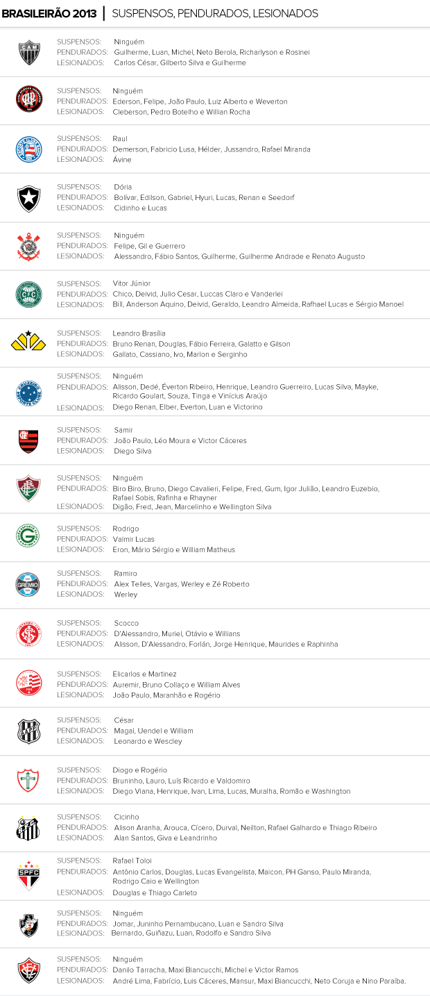 Confira abaixo a lista completa com os lesionados e suspensos da rodada#22: